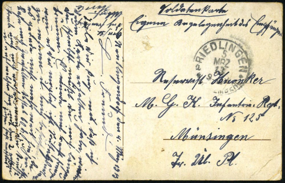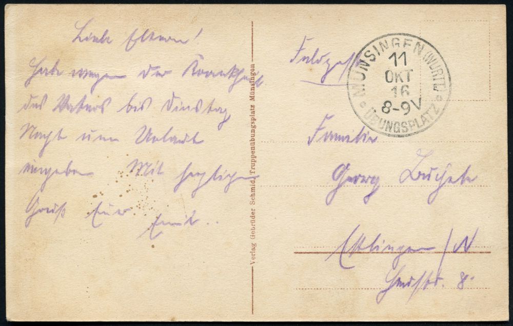 4784 | 16 € | POSTLEITRAUM 7400 (OHNE REUTLINGEN u. TÜBINGEN) : RIEDLINGEN/ a*/ WÜRTTEMBERG 1913 (5.3.) 1K + hs. Vermerk: "Soldatenkarte Eigene Angelegenheit des Empfängers" , portofreie Militär-Color-Foto-Ak.: Truppenübunsplatz.. Lagereingang (Eckbugspur) an Jnf. Rgt. Nr. 125, Truppenübungsplatz Münsingen | ![]() ![]() | |