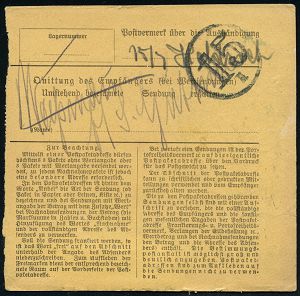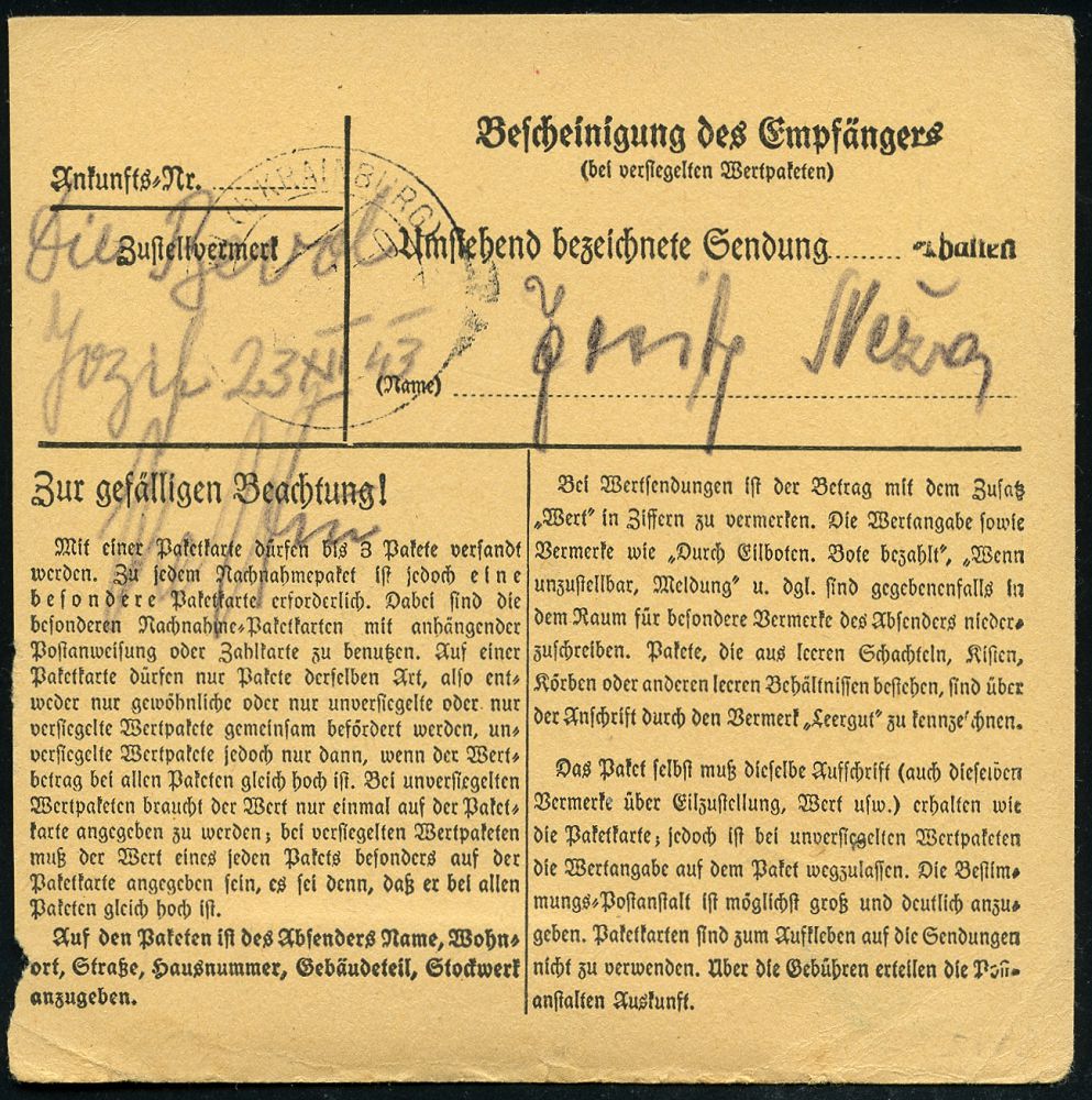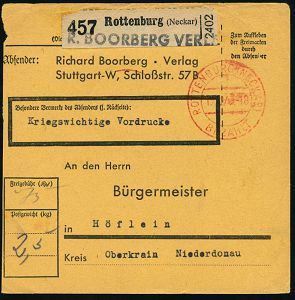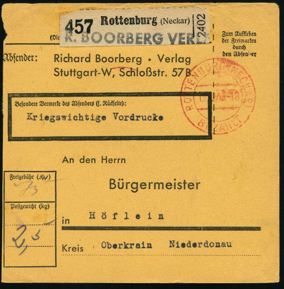 4786 | 25 € | POSTLEITRAUM 7400 (OHNE REUTLINGEN u. TÜBINGEN) : ROTTENBURG (NECKAR)/ BEZAHLT 1943 (15.12.) roter 2K-Steg-PFS + provis. Selbstbucher-Paketzettel: Rottenburg (Neckar)/R. BOORBERG VERLAG (viol. 1L zugestempelt) Zusatz "Kriegswichtige Vordrucke", Inl.-Selbstbucher-Paketkt. n. Höflein, Niederdonau (Dü-A-7 ,Nr.28 a) | ![]() ![]() | |