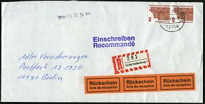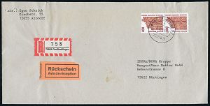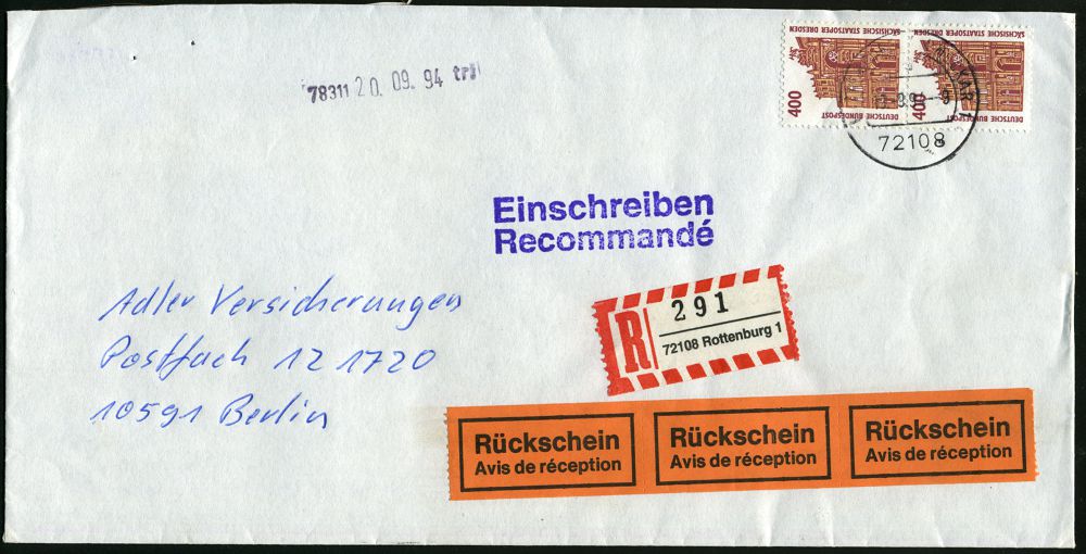 4645 | 15 € | POSTLEITRAUM 7400 (OHNE REUTLINGEN u. TÜBINGEN) : 72663 GROSSBETTLINGEN/ a 1994 (9.12.) 1K-Segment auf senkr. Paar 400 Pf. Bauwerke (Staatsoper Dresden) + RZ: 72663 Großbettlingen , klar gest. Inl.-R-Bf. "Rückschein" = 800 Pf. Porto! (Mi.1562 MeF + 10.- EUR) | ![]() | |