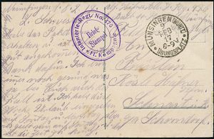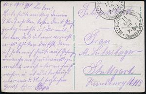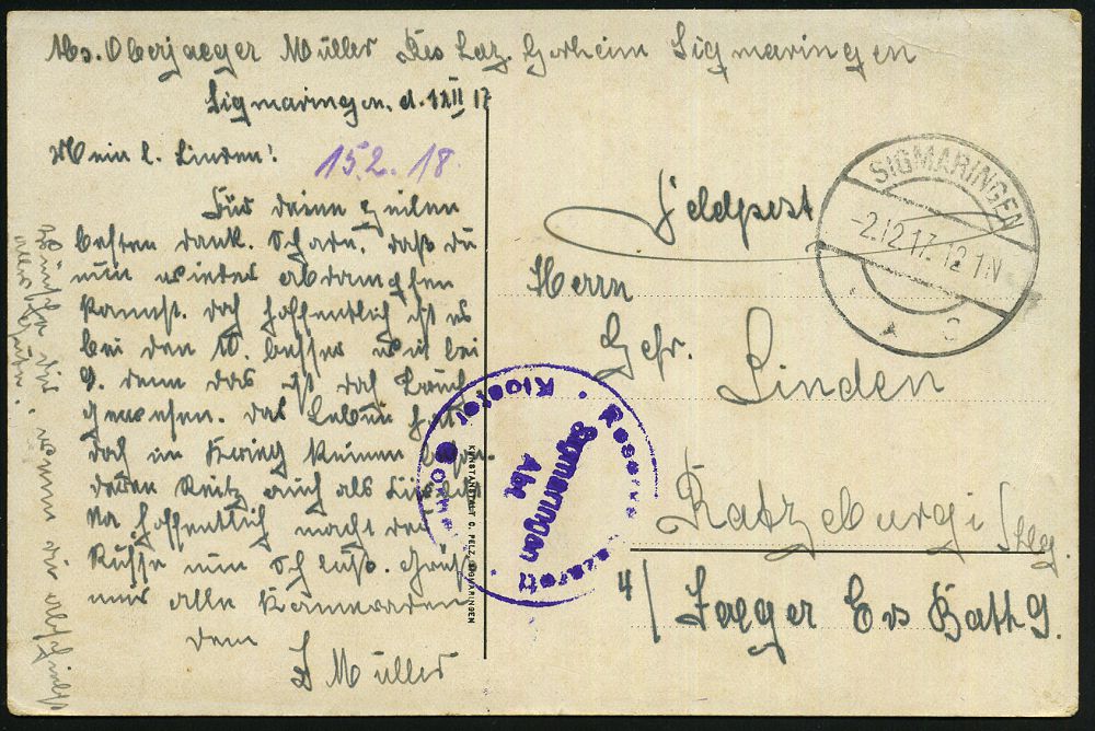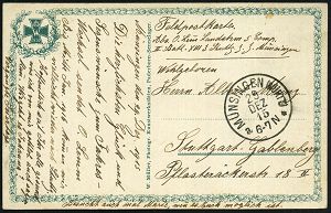 4791 | 15 € | POSTLEITRAUM 7400 (OHNE REUTLINGEN u. TÜBINGEN) : SIGMARINGEN/ **c 1917 (2.12.) 1K-Brücke + viol. 1K-HdN: Reserve-Lazarett/Sigmaringen/Abt./ Kloster Gorheim (teils gering undeutl.) + hs. Abs.: ".. Res. Laz. Gorheim Sigmaringen", passende Feldpost-Ak.: Kloster Gorheim n. Ratzeburg | ![]() ![]() | |
