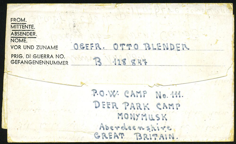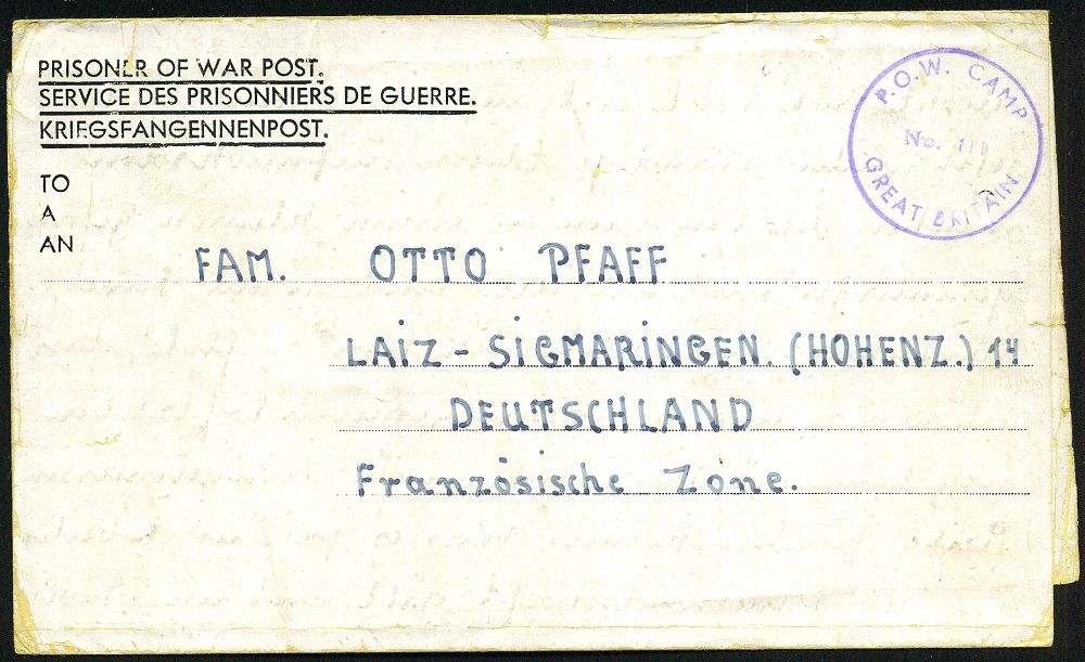 4794 | 15 € | POSTLEITRAUM 7400 (OHNE REUTLINGEN u. TÜBINGEN) : Sigmaringen-Laiz 1946 (15.5.) viol. 1K: P.O.W. CAMP/No.111/ GREAT BRITAIN auf Kgf.-Falt-Brief m i t Inhalt = Lager "Deer Park", Monymusk, Aberdeenshire nach Laiz | ![]() ![]() | |