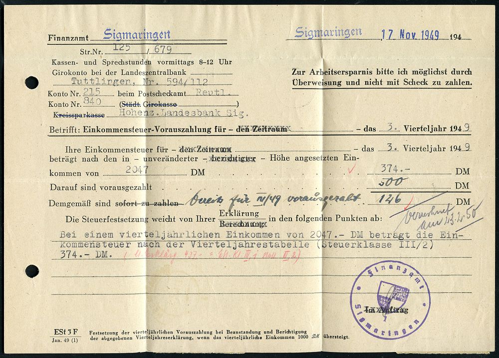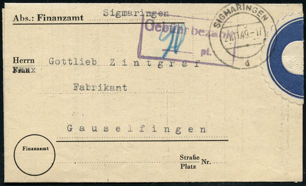 4796 | 15 € | POSTLEITRAUM 7400 (OHNE REUTLINGEN u. TÜBINGEN) : SIGMARINGEN/ d 1949 (21.11.) 2K-Steg + viol. Ra.2: Gebühr bezahlt/___ pf. = "R"pf. nach Währungsreform entfernt , klar gest. Falt-Dienstbf. (Finanzamt m.Siegel-Oblate) mit Inhalt: Einkommensteuer-Voranmeldung | ![]() ![]() | |