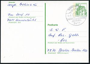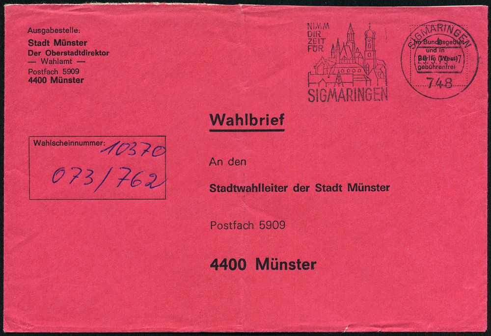 4801 | 14 € | POSTLEITRAUM 7400 (OHNE REUTLINGEN u. TÜBINGEN) : 748 SIGMARINGEN/ b/ NIMM/ DIR/ ZEIT/ FÜR/ SIGMARINGEN 1979 (29.5.) MWSt (histor.Ortsbild) auf rotem, portofreiem Wahl-Bf.! (n. Münster) | ![]() ![]() | |