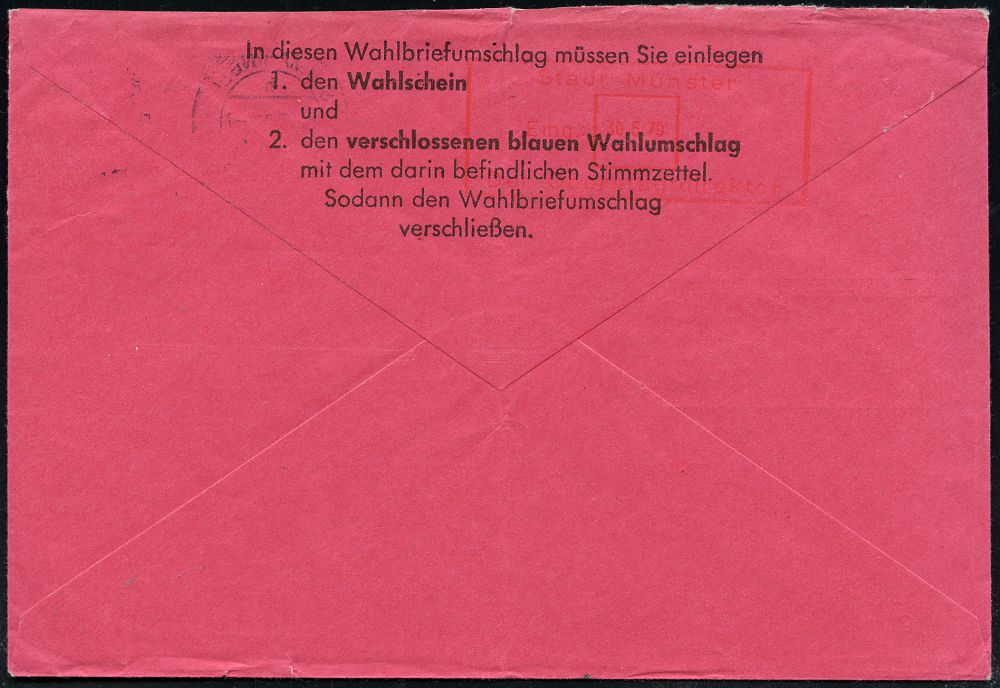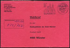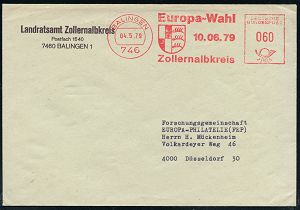 4609 | 12 € | POSTLEITRAUM 7400 (OHNE REUTLINGEN u. TÜBINGEN) : 746 BALINGEN/ Europa-Wahl/ 10.06.79/ Zollernalbkreis 1979 (4.5.) AFS Francotyp "Posthorn" (Wappen) Kommunal-Bf.: Landratsamt Zollernalbkreis, nur kurze Verwendungszeit! (Dü.E-23CO) | ![]() | |