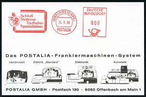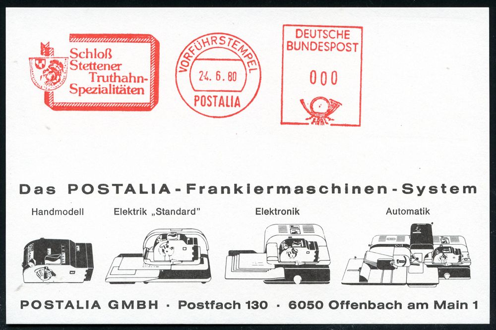 4805 | 16 € | POSTLEITRAUM 7400 (OHNE REUTLINGEN u. TÜBINGEN) : Stetten 1980 (24.6.) AFS: VORFÜHRSTEMPEL/POSTALIA/Schloß/Stettener/Truthahn-/Spezialitäten (Truthahn) seltene Postalia-Muster-Kt. (= Specimen) | ![]() | |