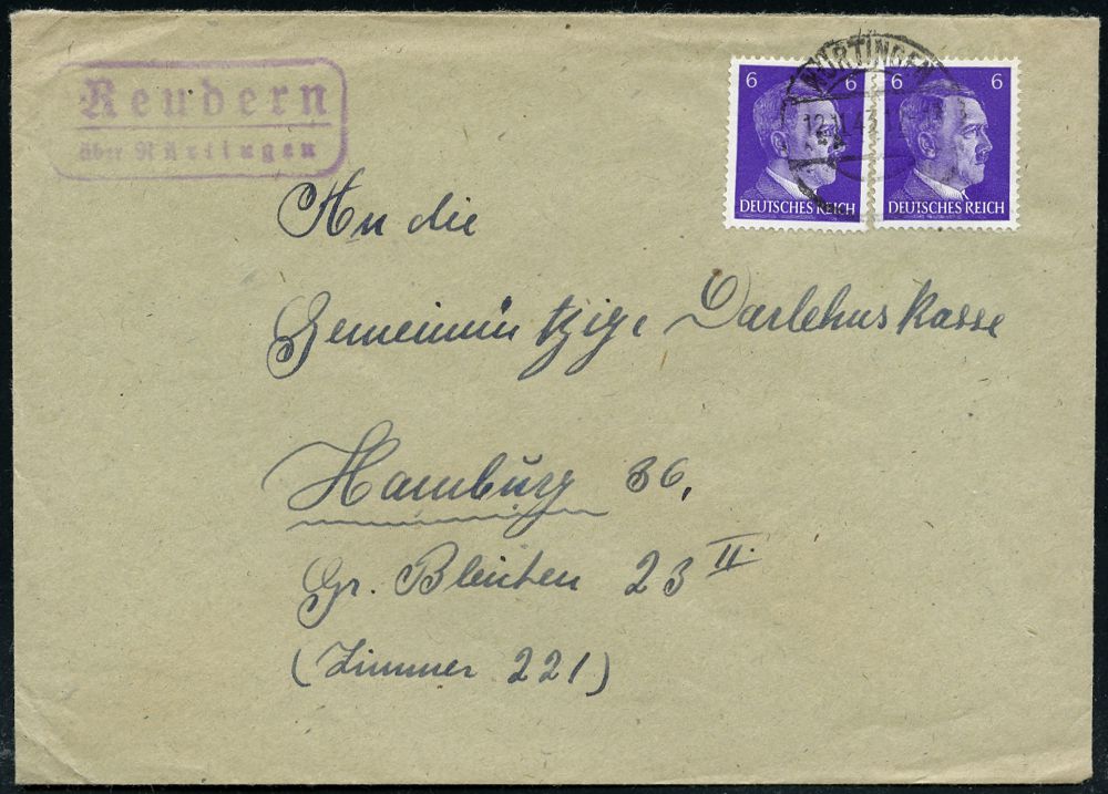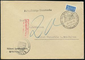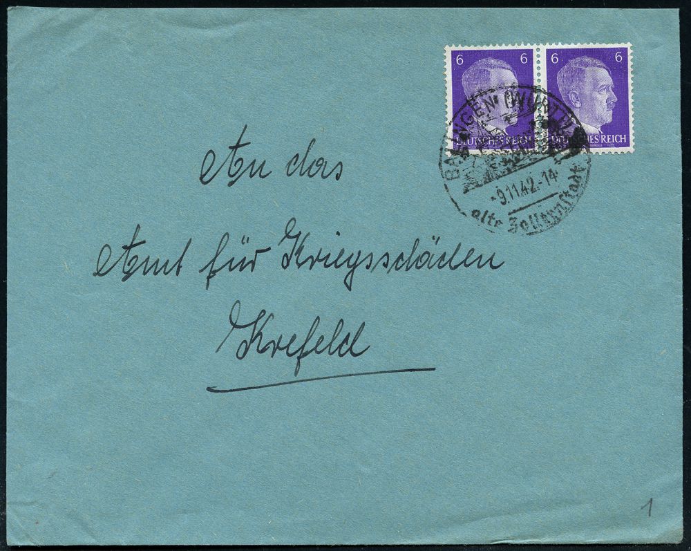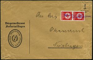 4706 | 20 € | POSTLEITRAUM 7400 (OHNE REUTLINGEN u. TÜBINGEN) : Neckaralfingen (Württ.) 1942 viol. 1L Notstempel , 2x auf Paar 12 Pf. Behördendienst a. Vordr.Bf.: Bürgermeisteramt.. (rs.Öffnungsriß) klar! , dekorat. Wappen! (Mi.D 172/MeF) | ![]() | |