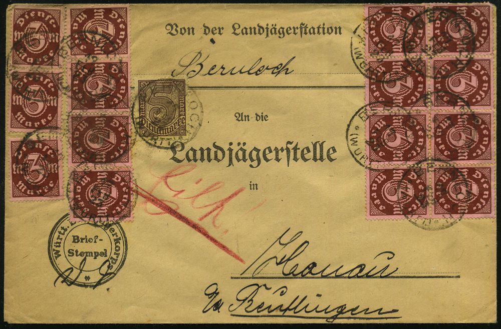 4612 | 20 € | POSTLEITRAUM 7400 (OHNE REUTLINGEN u. TÜBINGEN) : BERNLOCH/ *(WÜRTT)* 1923 (17.2.) 1K mehrfach auf Infla-Dienst-Massenfrankatur: 15 x 3 Mk. u. 5 Mk. + viol. 3K-HdN: Württ. Landjägerkorps , Dienst-Bf.: Von der Landjägerstation..Württ. Landjägerkorps (Mi.D 33, 15x D 67) | ![]() | |