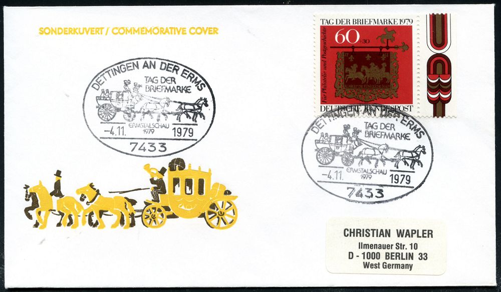 4615 | 5 € | POSTLEITRAUM 7400 (OHNE REUTLINGEN u. TÜBINGEN) : 7433 DETTINGEN AN DER ERMS/ TAG DER/ BRIEFMARKE 1979 (4.11.) SSt. auf EF 60 + 30 Pf: Tag der Briefmarke auf entspr. Sonerumschlag (Mi. 1023/EF) | ![]() | |