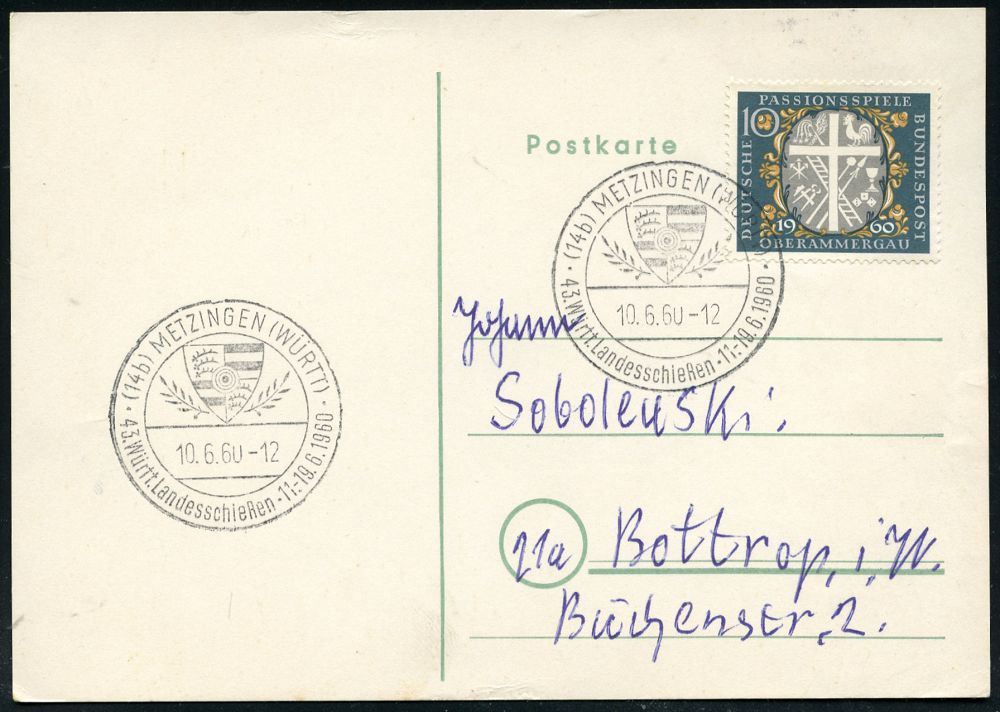 4661 | 14 € | POSTLEITRAUM 7400 (OHNE REUTLINGEN u. TÜBINGEN) : (14b) METZINGEN (WÜRRT)/ 43.Württ.Landesschießen 1960 (10.6.) HWSt (Wappen mit Zielscheibe) klar gest. Inl.-Karte (Bo.1) | ![]() | |