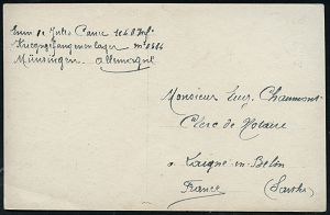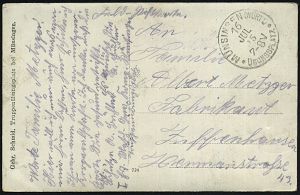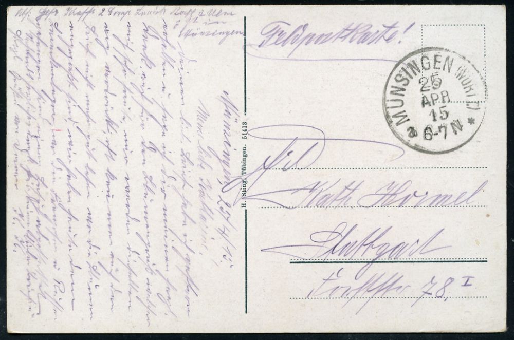 4692 | 11 € | POSTLEITRAUM 7400 (OHNE REUTLINGEN u. TÜBINGEN) : MÜNSINGEN (WÜRTT)/ a* 1915 (29.12.) 1K auf Color-Feldpost-Ak.: Kriegsgefangene Franzosen + hs. Abs. (Landsturm Münsingen) n. Stuttgart (Uhv. Walter Müller) | ![]() ![]() | |