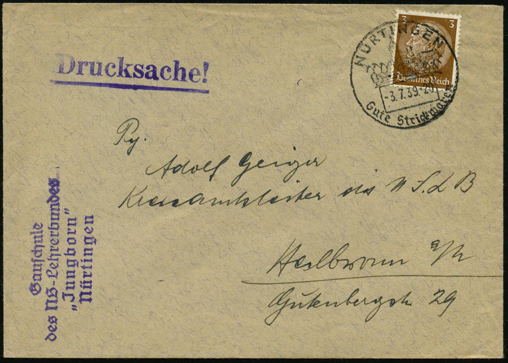 4715 | 18 € | POSTLEITRAUM 7400 (OHNE REUTLINGEN u. TÜBINGEN) : NÜRTINGEN/ Gute Strickwaren 1939 (3.7.) HWSt + viol. Abs.-4L: Gauschule/des NS-Lehrerbundes "Jungborn".. , EF 3 Pf. Hindenbg., Inl.-Drs.-Bf. (Bo.2) | ![]() | |