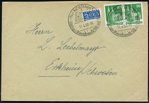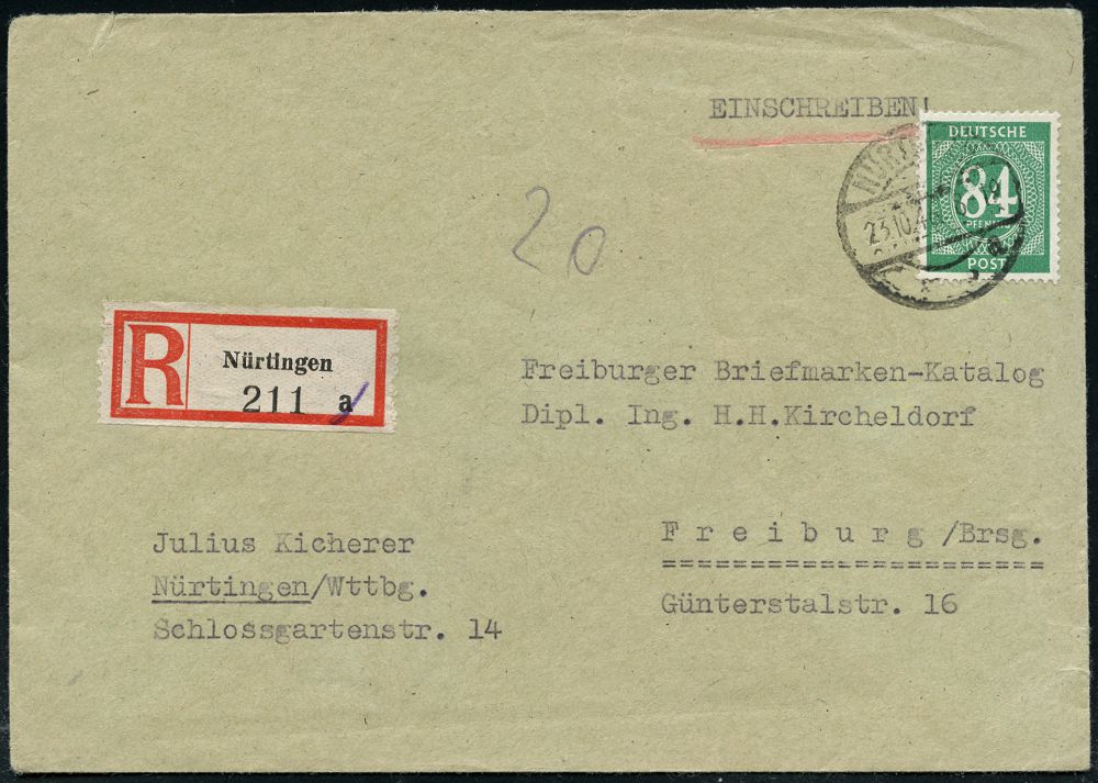 4717 | 14 € | POSTLEITRAUM 7400 (OHNE REUTLINGEN u. TÜBINGEN) : NÜRTINGEN/ a 1946 (23.10.) 1K-Brücke auf EF 84 Pf. Ziffer + RZ: Nürtingen, UB "a" gestrichen , Fern-R-Bf. n. Freiburg/Br. (Mi.936 EF) | ![]() | |