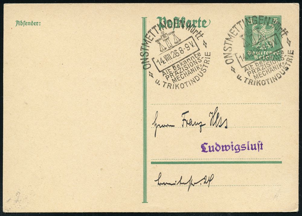 4723 | 18 € | POSTLEITRAUM 7400 (OHNE REUTLINGEN u. TÜBINGEN) : ONSTMETTINGEN Württ/ ..PRÄZISIONS-/ MECHANIK/ u.TRIKOTINDUSTRIE 1926 (14.8.) HWSt mit Datums-Rahmen = Type II (Waage) 2x klar auf Inl.-Karte (Bo.1, Type II, nur 1926 verwendet !) | ![]() | |