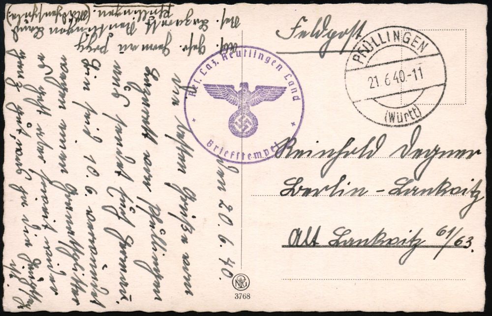 4736 | 12 € | POSTLEITRAUM 7400 (OHNE REUTLINGEN u. TÜBINGEN) : PFULLINGEN/ (Württ) 1940 (21.6.) 1K-Brücke + viol. 1K-HdN: Res. Laz.(arett) Reutlingen Land klar gest. Feldpost-Kt. n. Bln-Lankwitz | ![]() | |