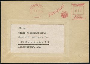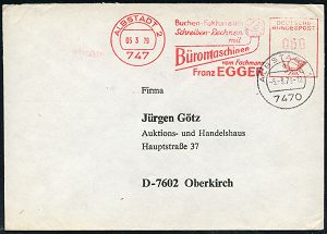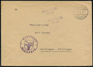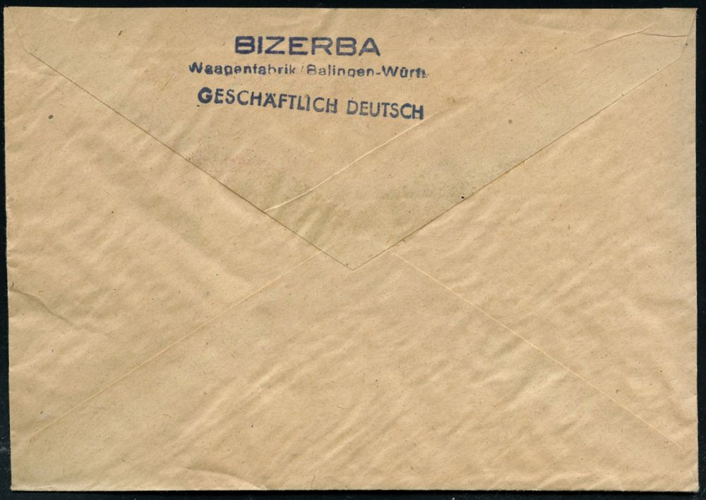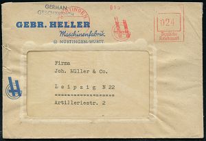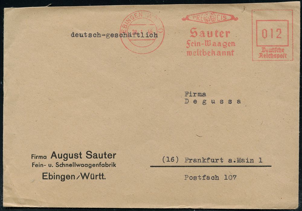 4634 | 25 € | POSTLEITRAUM 7400 (OHNE REUTLINGEN u. TÜBINGEN) : EBINGEN (WÜRTT)/ Sauter/ Fein-Waagen/ weltbekannt 1946 (28.1.) aptierter AFS Francotyp "Reichsadler" = entfernt = Notmaßnahme! (Firmen-Logo) auf Firmen-Bf.: August Sauter, Fein- u. Schnellwaagenfabrik (Dü.E-13 J-129o) | ![]() | |