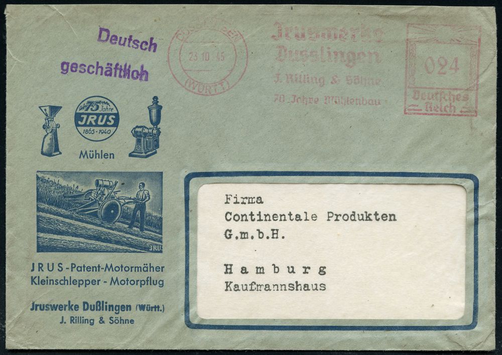 4620 | 28 € | POSTLEITRAUM 7400 (OHNE REUTLINGEN u. TÜBINGEN) : DUSSLINGEN/ (WÜRTT)/ Jruswerke/ ..J.Rilling & Söhne 1945 (23.10.) seltener, aptierter AFS Francotyp "Hakenkreuz" ) entfernt = Notmaßnahme! , zeitbedingt etw. schwach auf Reklame-Bf.: JRUS-Patent-Rasenmäher, Kleinschlepper - Motorpflug (Motorpflug u. Mühlen) Fern-Bf., vergl. Kat.-Nr. 4619 (Dü.E-12 K-98o) | ![]() | |