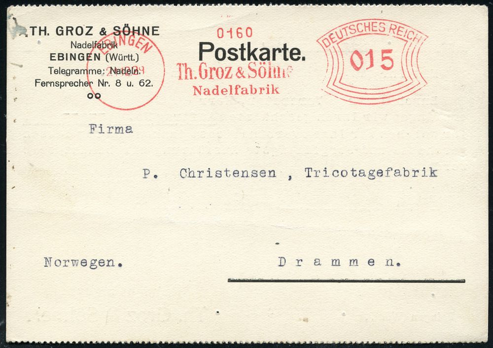 4623 | 20 € | POSTLEITRAUM 7400 (OHNE REUTLINGEN u. TÜBINGEN) : EBINGEN/ Th.Groz & Söhne/ Nadelfabrik 1929 (21.12.) AFS Francotyp "Bogenrechteck" 015 Pf. auf Firmen-Ausll.-Kt. n. Norwegen (Dü.E-1BAh) | ![]() | |