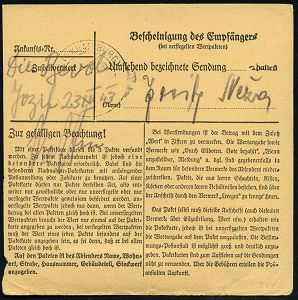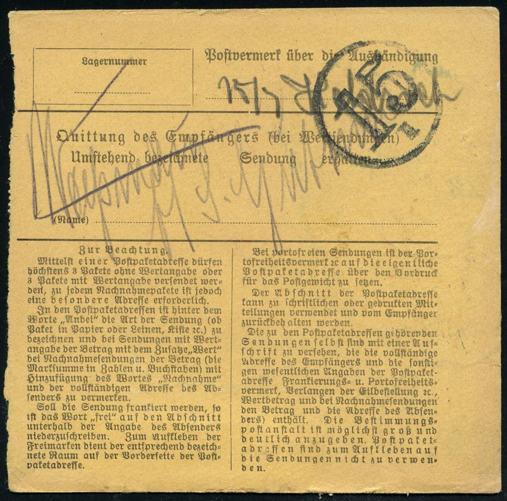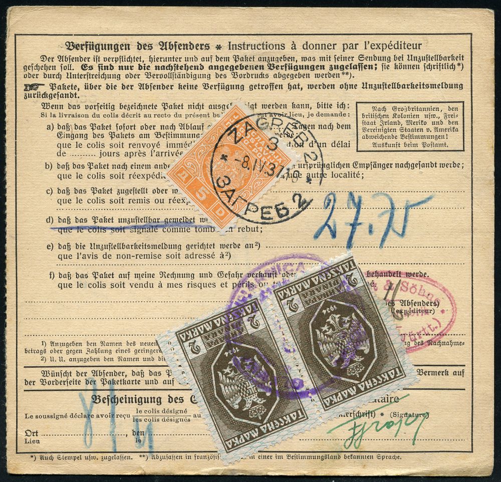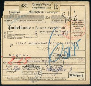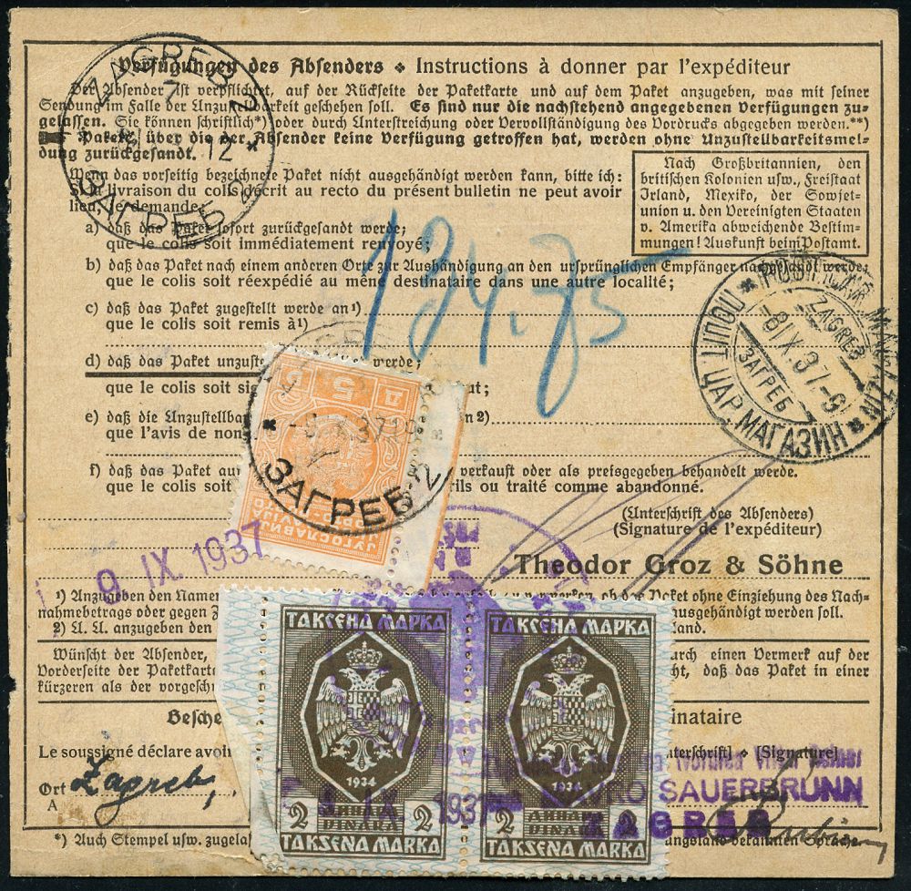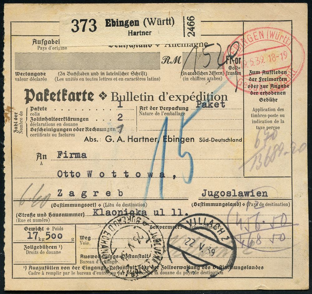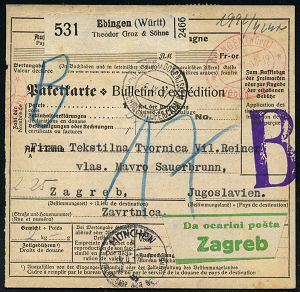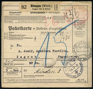 4625 | 25 € | POSTLEITRAUM 7400 (OHNE REUTLINGEN u. TÜBINGEN) : EBEINGEN (Württ)/ **/ Gebühr bezahlt 1937 (1.4.) Doppeloval-PFS + schw. Selbstbucher-Paketzettel: Ebingen (Württ.)/ Eugen Ott & Söhne + TS München 3, Ausl.-Selbstbucher-Paketkarte n. Zagreb, rs. jugoslaw. Tax- u. Fiskalmarken (Dü.A-5, Nr.20) | ![]() ![]() | |