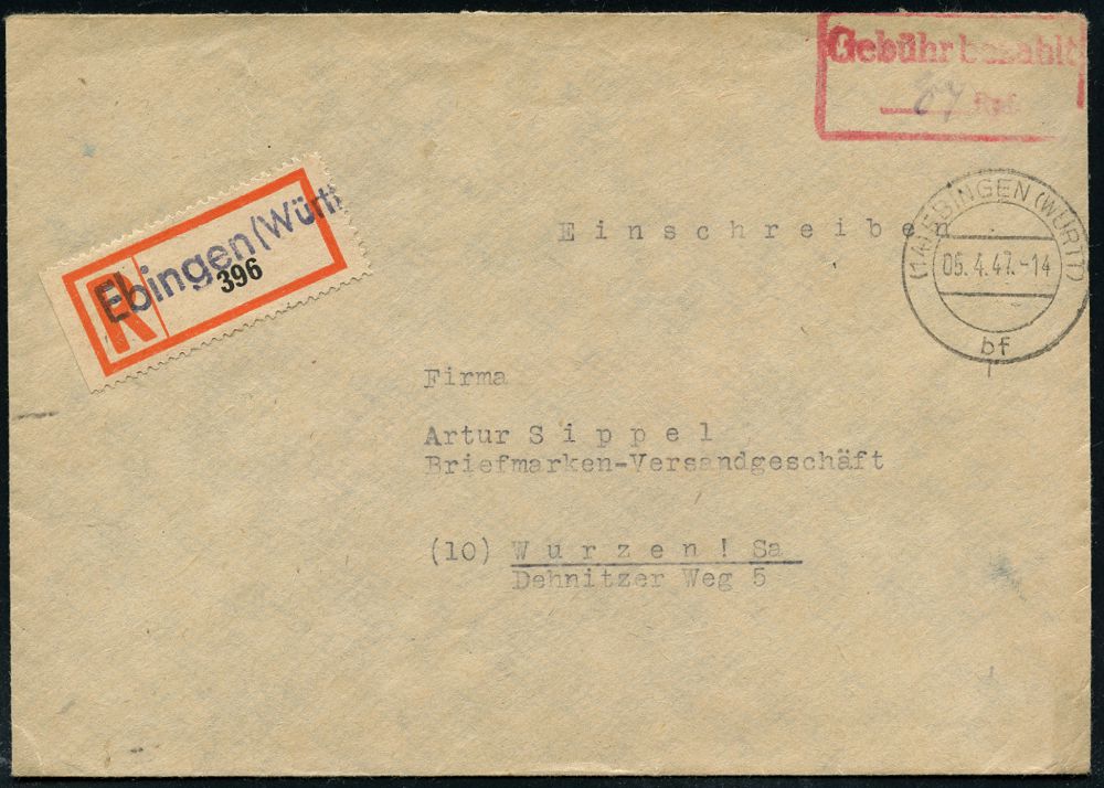 4637 | 15 € | POSTLEITRAUM 7400 (OHNE REUTLINGEN u. TÜBINGEN) : (14) EBINGEN (WÜRTT)/ bf 1947 (5.4.) 2K-Steg + roter Ra2: Gebühr bezahlt/....Rpf. (hs "84") + provis. RZ: Ebingen (Württ) (= viol. 1L a. Blanco-RZ) Fern-R-Bf. n. Wurzen/Sa. | ![]() ![]() | |