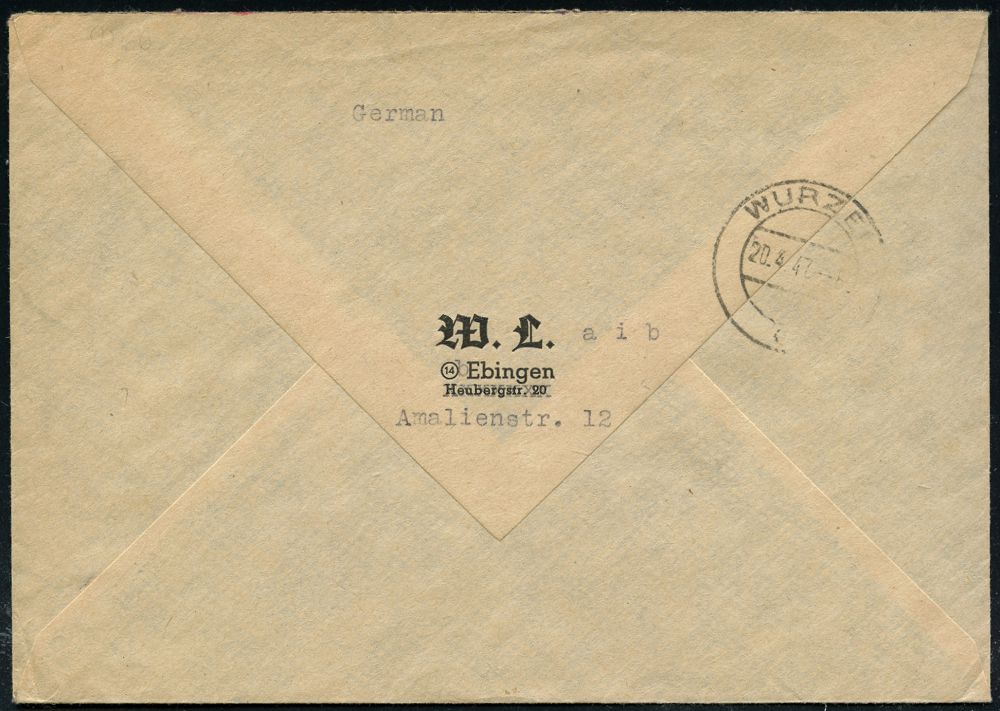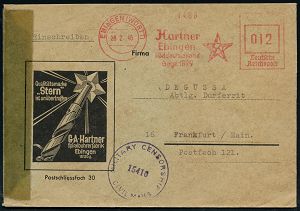 4635 | 30 € | POSTLEITRAUM 7400 (OHNE REUTLINGEN u. TÜBINGEN) : EBINGEN (WÜRTT)/ Hartner/ ..Gegr.1879 1946 (28.2.) aptierter AFS Francotyp "Reichsadler" = entfernt = Notmaßnahme! (Firmen-Logo: Stern) + US-Zensurstreifen: EXAMINED BY + Zensur-1K: MILITARY CENSORSHIP/ 15410/ CIVIL MAILS (= Esslingen, Rie.A-1, A-107) Reklame-Bf.: ,,"Stern".. Spiralbohrer.., Inl.-Zensur-Bf. n. Frankfurt/M. (Dü.E-13 J-129o) | ![]() ![]() | |