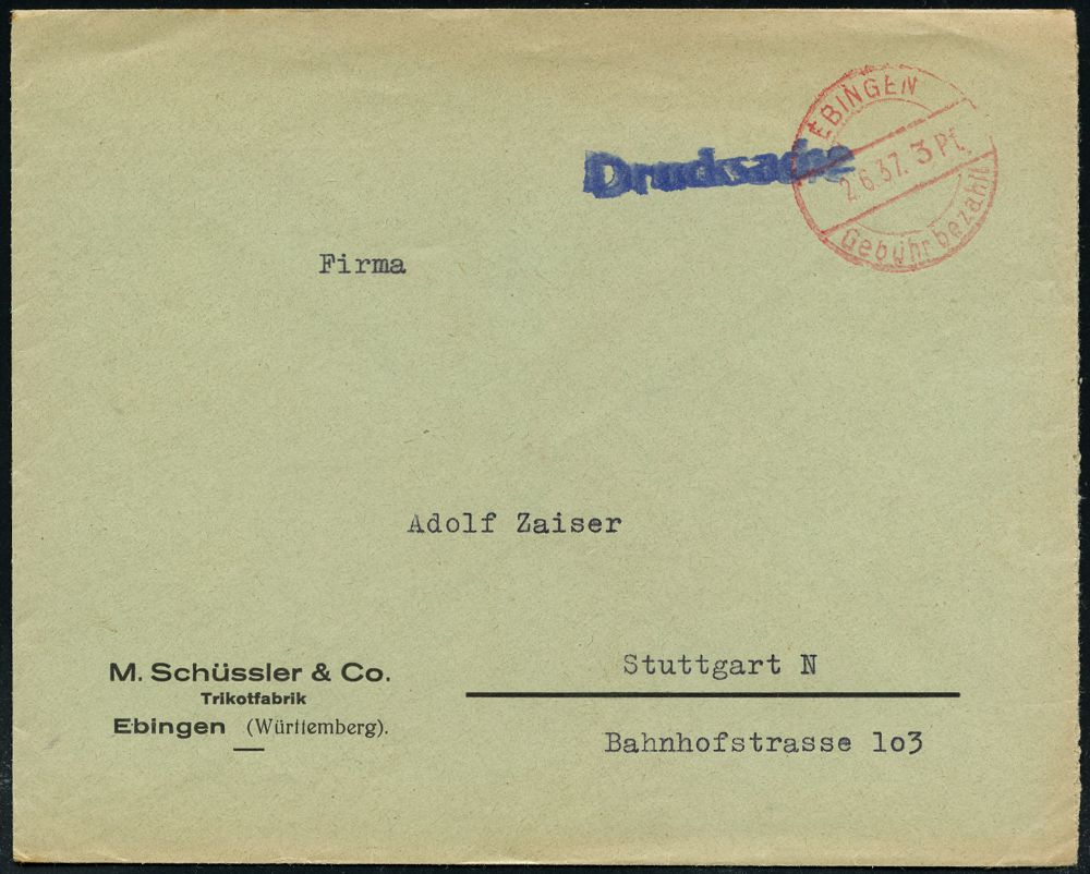 4630 | 10 € | POSTLEITRAUM 7400 (OHNE REUTLINGEN u. TÜBINGEN) : EBINGEN/ 3 Pf./ Gebühr bezahlt 1937 (2.6.) 1K-Brücken-PFS mit Wertziffer ohne Uhrzeit auf Firmen-Bf.: M. Schüssler & Co., Trikotfabrik.. (Dü.A-6, Nr.25) | ![]() | |