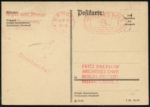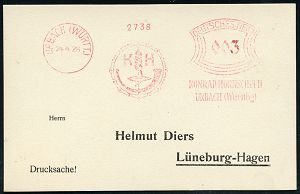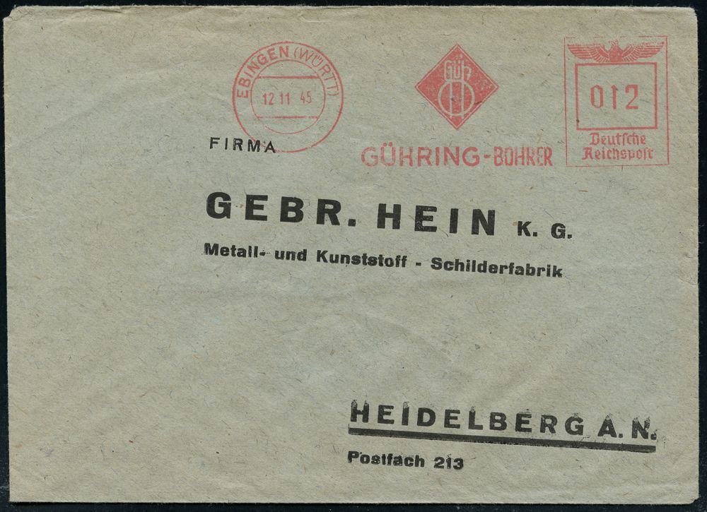 4633 | 40 € | POSTLEITRAUM 7400 (OHNE REUTLINGEN u. TÜBINGEN) : EBINGEN (WÜRTT)/ Güh/ GÜHRING-BOHRER 1945 (12.11.) AFS Francotyp "Reichsadler" u n v e r ä n d e r t weiterverwendet mit Reichsadler u. Inschrift: Deutsche Reichspost (Firmen-Logo) Firmen-Fern-Bf. (rs. kl. Klappenmäng.) n. Heidelberg, vergl. Kat.-Nr. 4632 (Dü.E-5CGo, unverändert !) | ![]() | |