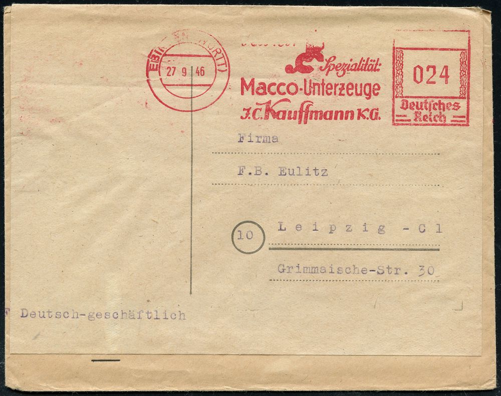 4636 | 25 € | POSTLEITRAUM 7400 (OHNE REUTLINGEN u. TÜBINGEN) : EBINGEN (WÜRTT)/ ..Macco-Unterzeuge/ J.C.Kauffmann KG 1946 (27.9.) aptierter AFS Francotyp "Hakenkreuz" = entfernt = Notmaßnahme! (Firmen-Logo, oben teils etw. undeutl.) Recycling-Fern-Bf. n. Leipzig, SBZ, vergl. Kat.-Nr. 4629 (Dü.E-12 K-100 = seltene Type!) | ![]() | |