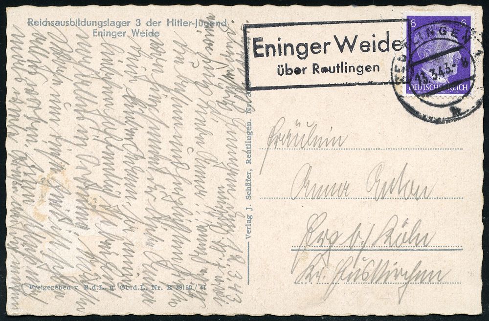 4638 | 25 € | POSTLEITRAUM 7400 (OHNE REUTLINGEN u. TÜBINGEN) : Eninger Weide/ über Reutlingen 1943 (13.4.) viol. Ra.2 = PSt.II + 2K-Steg: REUTLINGEN 1/b auf s/w.-Foto-Ak.: Reichsausbildungslager 3 der Hitler-Jugend, Eninger Weide, Bedarf! (Mi.785) | ![]() ![]() | |