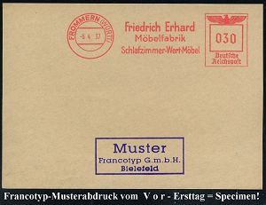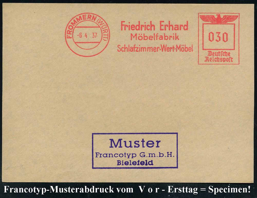 4640 | 35 € | POSTLEITRAUM 7400 (OHNE REUTLINGEN u. TÜBINGEN) : FROMMERN (WÜRTT)/ Friedrich Erhard/ Möbelfabrik.. 1937 (6.4.) AFS-Musterabdruck Francotyp "Reichsadler" , glasklar gest. Francotyp-Musterblatt vom V o r - Ersttag! (mit Attest), selten! (Dü.E-5CGo) | ![]() ![]() | |