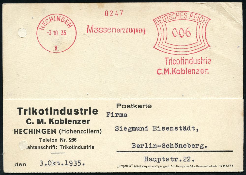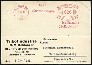 4647 | 18 € | POSTLEITRAUM 7400 (OHNE REUTLINGEN u. TÜBINGEN) : HECHINGEN/ 1/ Massenerzeugung/ Tricotindustrie/ C.M.Koblenzer 1935 (1.10.) AFS Francotyp "Bogenrechteck" , (Kt. Reg.-Lochung geschl., kl. Eckbugspur) klar gest. Firmen-Kt. (wahrscheinlich jüdische Firma) n. Berlin (Dü.E-1CEh) | ![]() | |