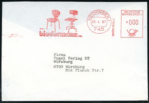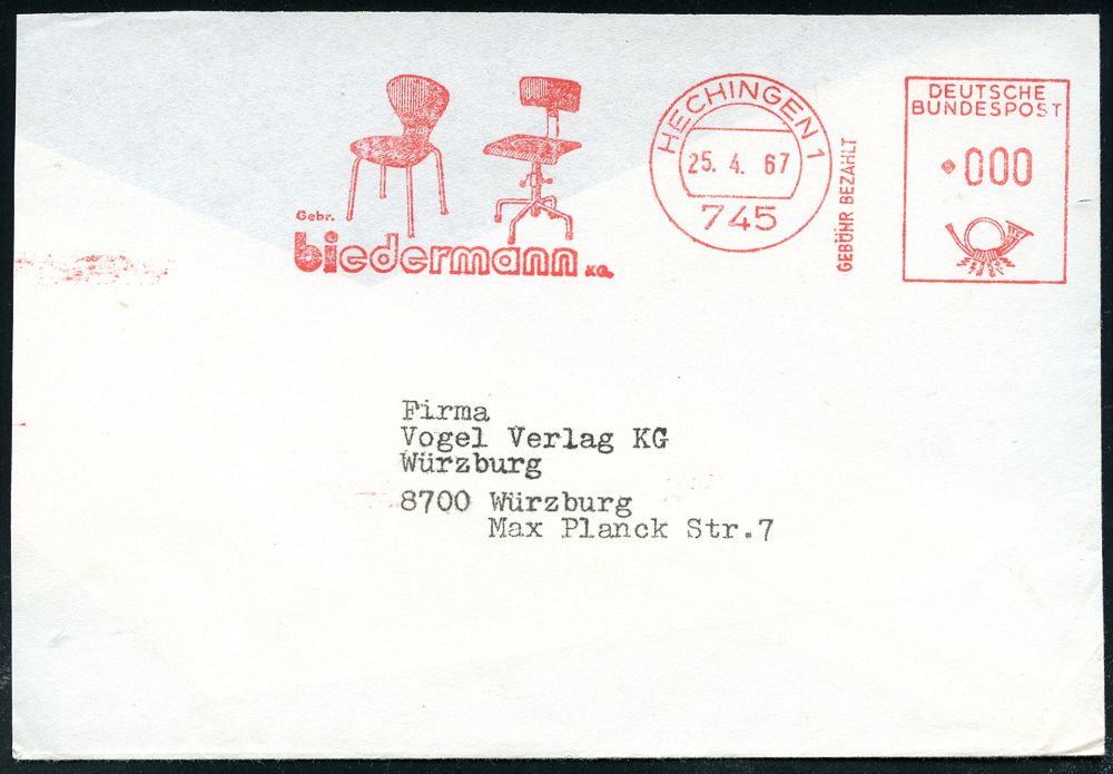 4650 | 10 € | POSTLEITRAUM 7400 (OHNE REUTLINGEN u. TÜBINGEN) : 745 HECHINGEN 1/ GEBÜHR BEZAHLT/ Gebr./ biedermann KG 1967 (25.4.) AFS Francotyp "Posthorn" in 000 + Gebühr bezahlt = Massen-Drs.! (2 Bürostühle) links verkürzter Fern-Bf. (Dü.E-26) | ![]() | |