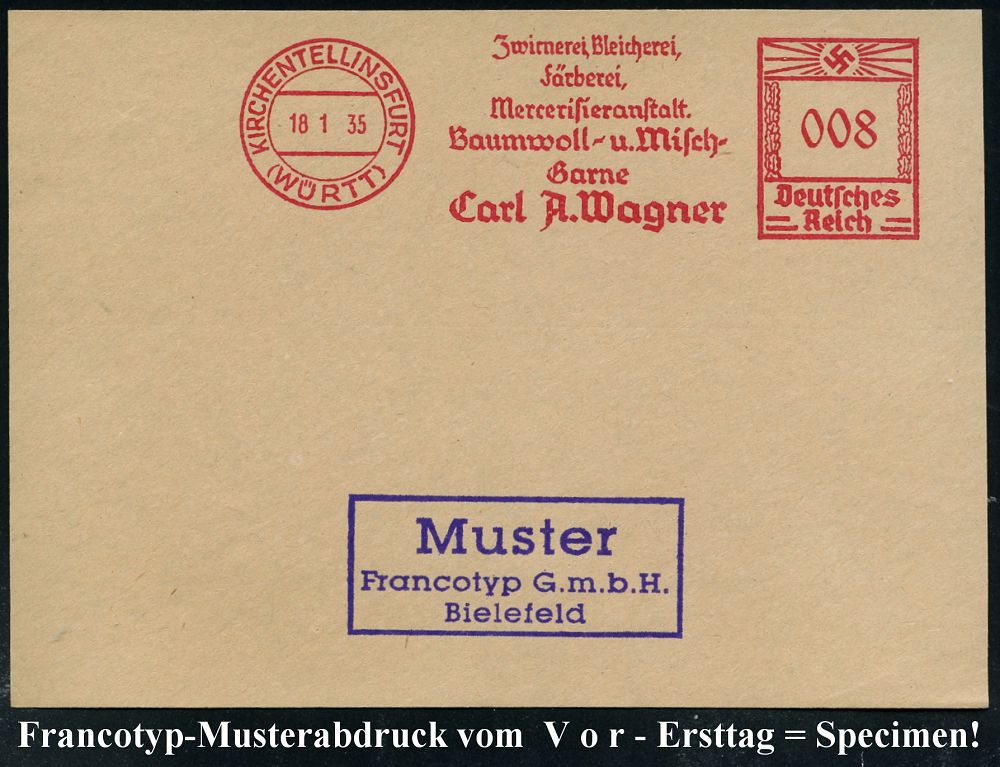 4654 | 35 € | POSTLEITRAUM 7400 (OHNE REUTLINGEN u. TÜBINGEN) : KIRCHENTELLINSFURT/ (WÜRTT)/ Zwirnerei,Bleicherei/ Färberei/ Merisieranstalt/ Baumwoll-u.Misch-/ Garne/ Carl A.Wagner 1935 (18.1.) AFS-Musterabdruck Francotyp "Hakenkreuz" , glasklar gest. Francotyp-Musterblatt vom V o r - Ersttag ! (mit Attest), selten! (Dü.E-3CEo) | ![]() ![]() | |