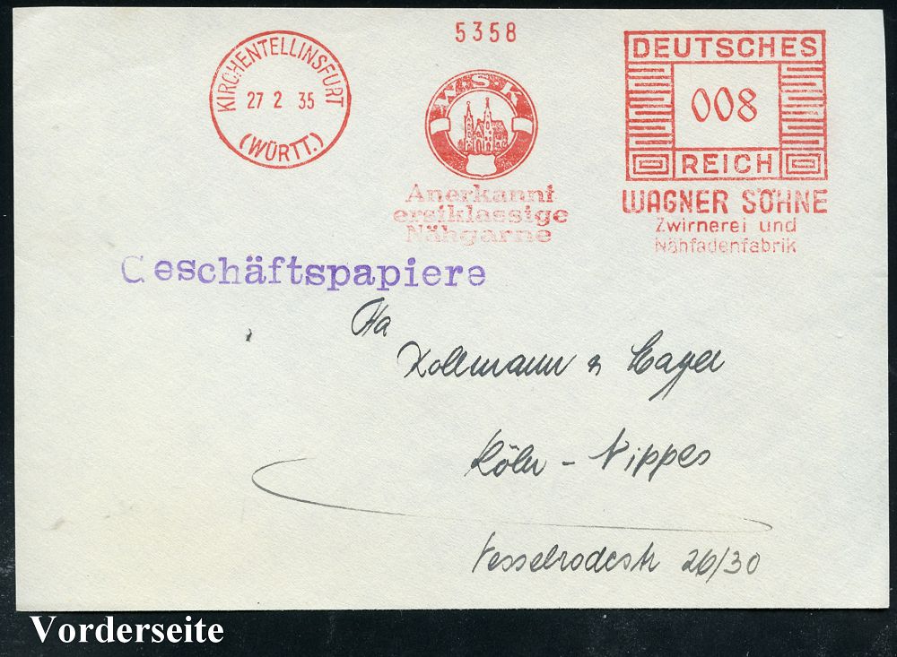 4655 | 14 € | POSTLEITRAUM 7400 (OHNE REUTLINGEN u. TÜBINGEN) : KIRCHENSTELLINSFURT/ (WÜRTT)/ W-S-K/ ..WAGNER SÖHNE/ Zwirnerei u./ Nähfadenfabrik 1935 (27.2.) AFS Francotyp "Mäanderrechteck" (Firmen-Logo mit Kirche) Bedarfs-Vorderseite (Dü.E-2CEh) | ![]() | |
