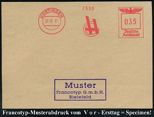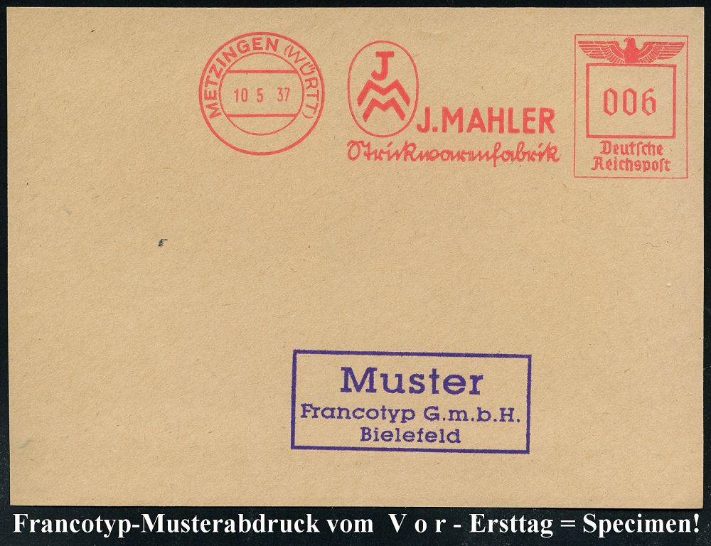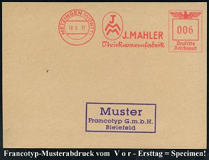 4656 | 35 € | POSTLEITRAUM 7400 (OHNE REUTLINGEN u. TÜBINGEN) : METZINGEN (WÜRTT)/ JMM/ J.MAHLER/ Strickwarenfabrik 1937 (10.5.) AFS-Musterabdruck Francotyp "Reichsadler" (Monogr.-Loto, Textt teils Sütterlin) glasklar gest. Francoty-Musterblatt vom V o r - Ersttag! (mit Attest), selten! (Dü.E-5CGo) | ![]() ![]() | |