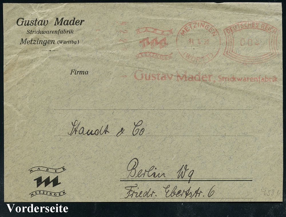 4658 | 18 € | POSTLEITRAUM 7400 (OHNE REUTLINGEN u. TÜBINGEN) : METZINGEN/ (WÜRTT)/ ..Gustav Mader Strickwarenfabrik 1934 (14.4.) seltener AFS-Typ Komusina "Bogenrechteck" (Firmen-Logo) motivgl. Firmen-Vorderseite (oben Knitter) die Fa. Komusina ging 1930 in Konkurs, es wurden keine weiteren Apparate mehr hergestellt (Dü.E-1 A) | ![]() | |