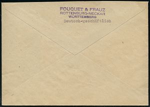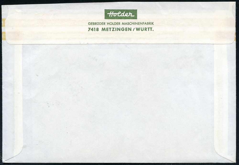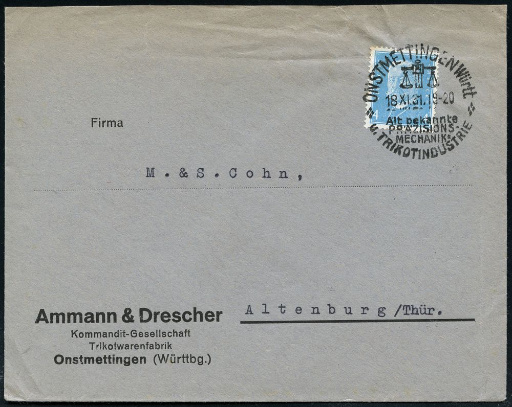 4725 | 15 € | POSTLEITRAUM 7400 (OHNE REUTLINGEN u. TÜBINGEN) : ONSTMETTINGEN Württ/ .PRÄZISIONS-/ MECHANIK/ u.TRIKOTINDUSTRIE 1931 (19.XI.) HWSt ohne Datumsrahmen (Waage) Firmen-Bf.: Ammann & Drescher KG, Trikotwarenfabrik.. (rs. fehlt Klappe) (Bo.1 Type I) | ![]() | |