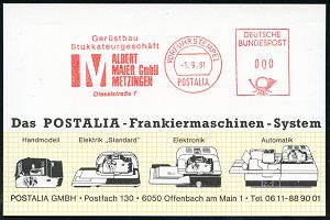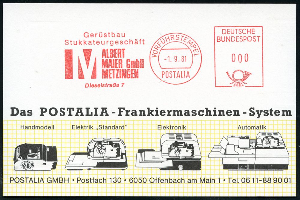 4663 | 18 € | POSTLEITRAUM 7400 (OHNE REUTLINGEN u. TÜBINGEN) : Metzingen 1981 (1.9.) AFS.: VORFÜHRSTEMPEL/POSTALIA/Gerüstbau/Stukkateurgeschäft/ALBERT/MAIER GmbH.. (Monogr.-Logo) seltene Postalia-Muster-Kt. (= Specimen) | ![]() | |