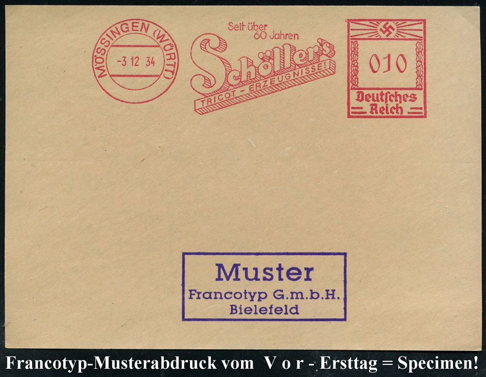 4664 | 35 € | POSTLEITRAUM 7400 (OHNE REUTLINGEN u. TÜBINGEN) : MÖSSINGEN (WÜRTT)/ ..Schöller´s/ TRIKOT-ERZEUGNISSE! 1934 (3.12.) AFS-Musterabdruck Francotyp "Hakenkreuz" , glasklar gest. Francotyp-Musterblatt vom V o r - Ersttag ! (mit Attest), selten!, vergl. Kat.-Nr. 4731-32 (Dü.E-3CEo) | ![]() ![]() | |