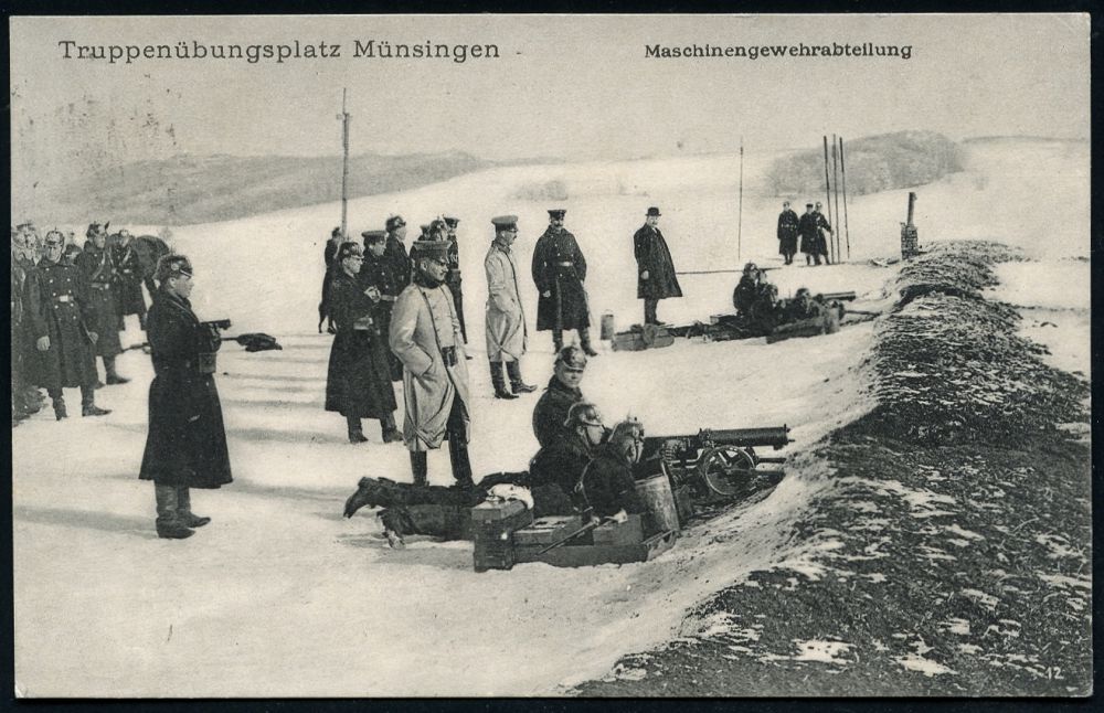 4670 | 12 € | POSTLEITRAUM 7400 (OHNE REUTLINGEN u. TÜBINGEN) : MÜNSINGEN (WÜRTT.)/ *ÜBUNGSPLATZ* 1911 (27.4.) 1K = Hauspostamt Truppenübungsplatz auf s/w.-Foto-Ak.: Maschinengewehrabteilung (im Winter) n. Heidenheim/Br. (Mi.85) | ![]() ![]() | |