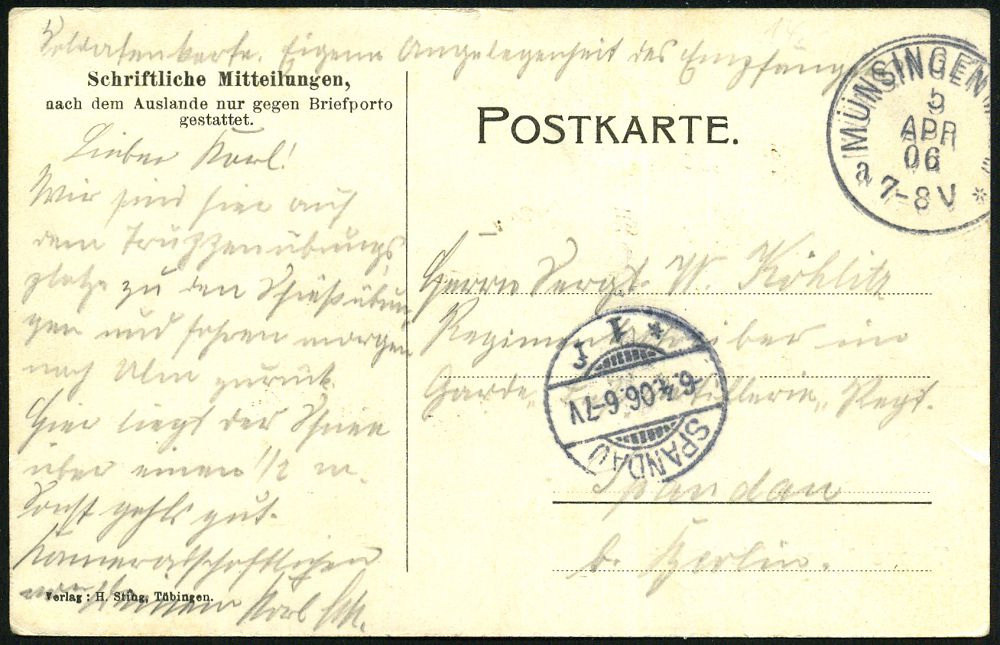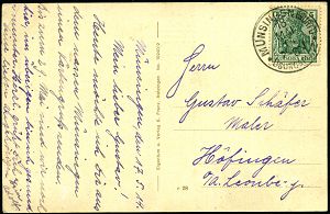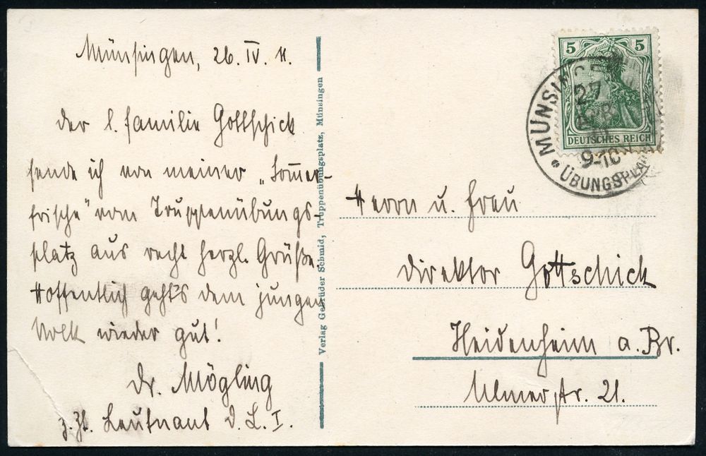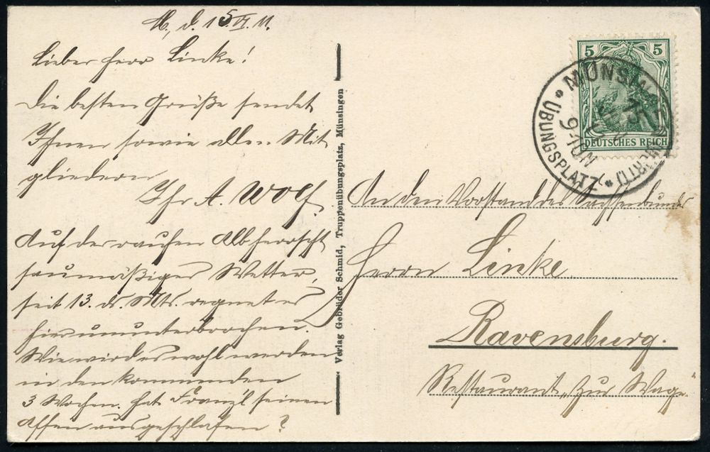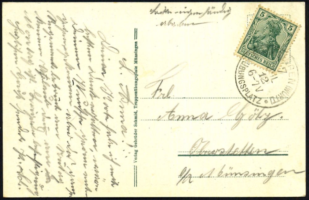4665 | 15 € | POSTLEITRAUM 7400 (OHNE REUTLINGEN u. TÜBINGEN) : MÜNSINGEN (WÜRTT)/ a* 1906 (5.4.) 1K (rechts nicht ganz voll) + hs. Vermerk "Soldatenkarte Eigene Angelegenheit des Empfängers" , portofreie Militär-Color-Ak.: Truppenübungsplatz Münsingen (Baracken) n. Spandau, vs. AS. = Manöver-Feldpost! | ![]() ![]() | |