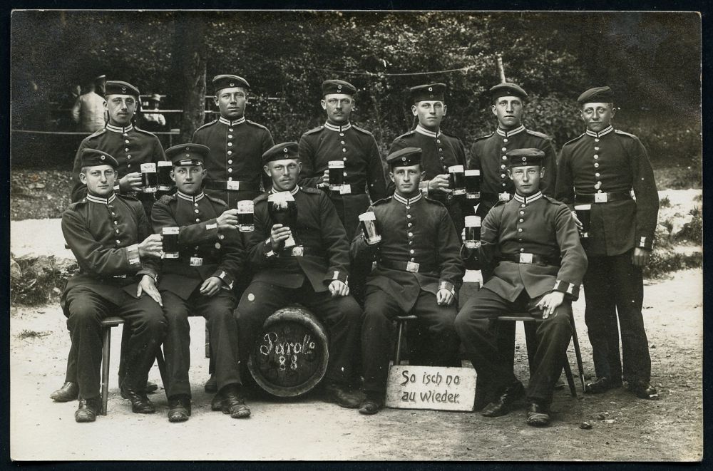 4672 | 14 € | POSTLEITRAUM 7400 (OHNE REUTLINGEN u. TÜBINGEN) : MÜNSINGEN (WÜRTT.)/ *ÜBUNGSPLATZ* 1911 (29.6.) 1K + hs. Vermerk: "Soldaten Karte Eigene Angelegenheit des Empfängers" auf individueller s/w.-Foto-Ak.: Soldatengruppe mit Bierkrügen (Parole 88..) portofreie Manöver-Kt. n. Tübingen | ![]() ![]() | |