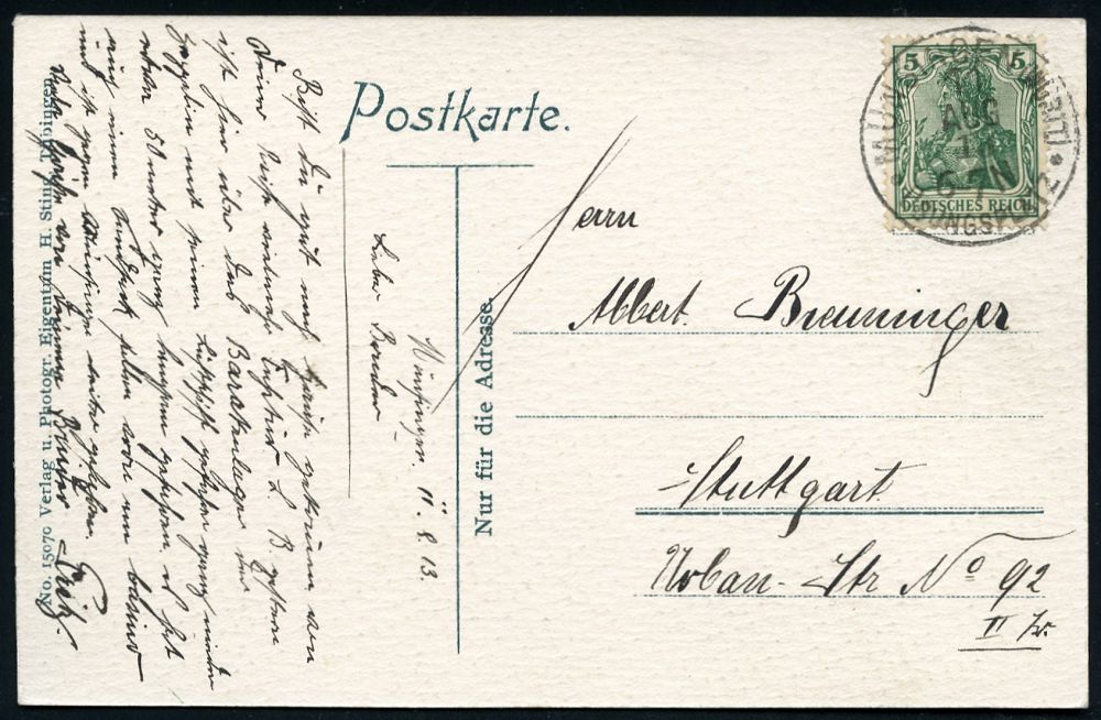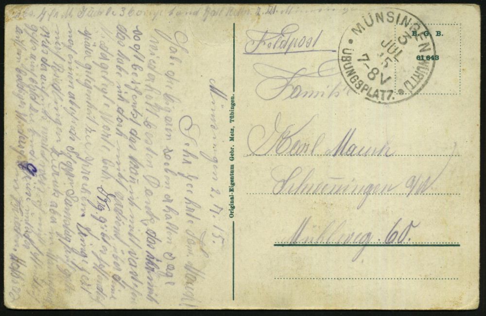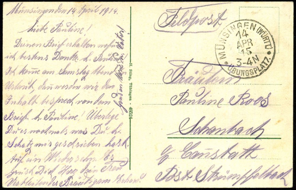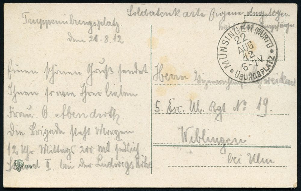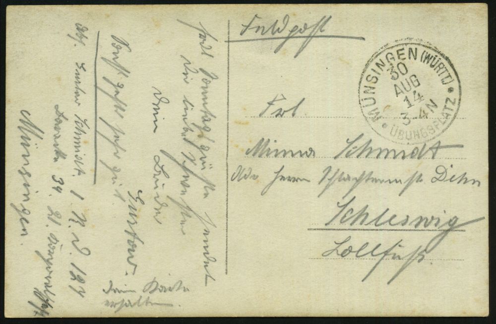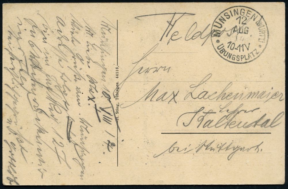 4679 | 15 € | POSTLEITRAUM 7400 (OHNE REUTLINGEN u. TÜBINGEN) : MÜNSINGEN (WÜRTT.)/ *ÜBUNGSPLATZ* 1914 (12.8.) 1K = Hauspostamt Truppenübungsplatz auf s/w.-Feldpost-Ak.: Vor und nach dem Gedecht (2 Ansichten) frühe Feldpost-Kt. vom 12. Kriegstag n. Kaltental | ![]() ![]() | |