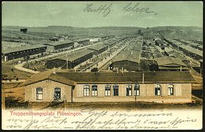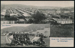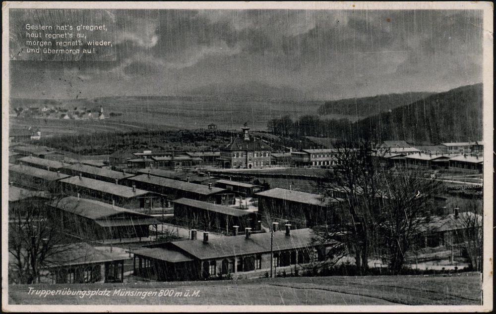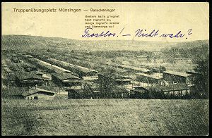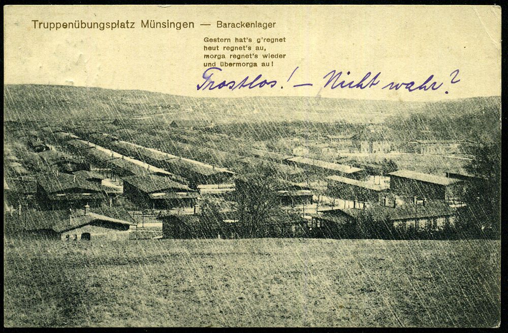 4677 | 12 € | POSTLEITRAUM 7400 (OHNE REUTLINGEN u. TÜBINGEN) : MÜNSINGEN (WÜRTT.)/ *ÜBUNGSPLATZ* 1914 (18.5.) 1K = Hauspostamt Truppenübungsplatz auf s/w.-Foto-Ak.: Barackenlager im Regen mit hs. Zusatz "Trostlos ! - Nicht wahr?" n. Höfingen (Mi.85) | ![]() ![]() | |