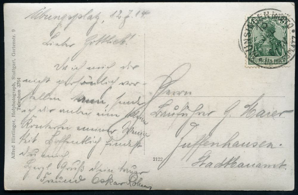 4678 | 14 € | POSTLEITRAUM 7400 (OHNE REUTLINGEN u. TÜBINGEN) : MÜNSINGEN (WÜRTT.)/ *ÜBUNGSPLATZ* 1914 (13.7.) 1K = Hauspostamt Truppenübungsplatz auf s/w.-Foto-Atelier-Ak.: "Wer weiß ob wir uns wiedersehn!" mit großer Soldatengruppe kurz vor Beginn des I. Weltkrieges! n. Zuffenhausen | ![]() ![]() | |
