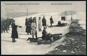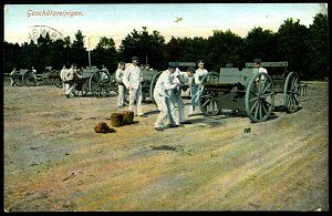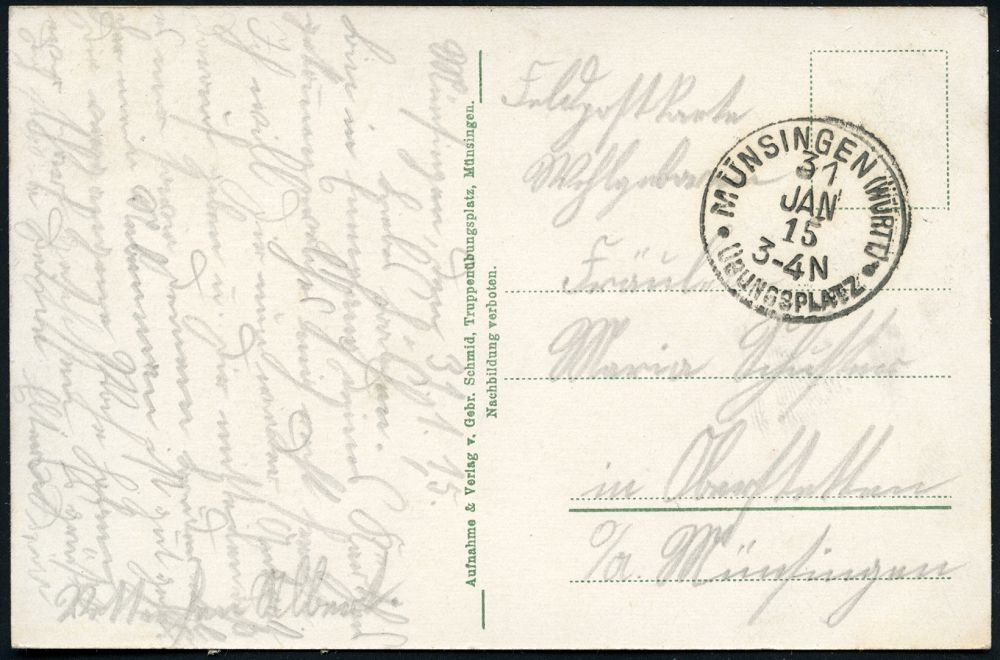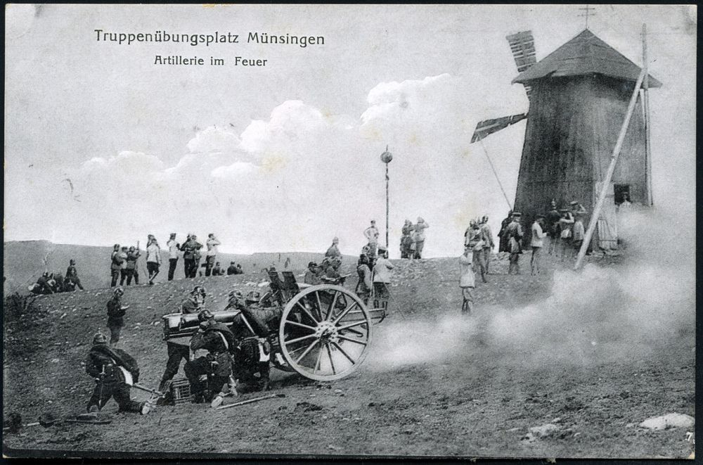 4681 | 12 € | POSTLEITRAUM 7400 (OHNE REUTLINGEN u. TÜBINGEN) : MÜNSINGEN (WÜRTT.)/ *ÜBUNGSPLATZ* 1915 (31.1.) 1K = Hauspostamt Truppenübungsplatz auf s/w.-Foto-Ak.: .. Artillerie im Feuer (mit Windmühle) klar gest. Feldpostkarte n. Oberstetten (Verlag Gebr. Schmidt, Münsingen) | ![]() ![]() | |