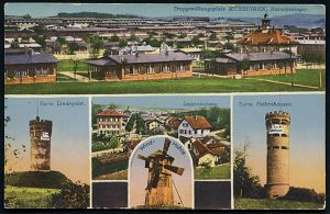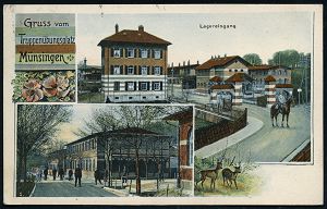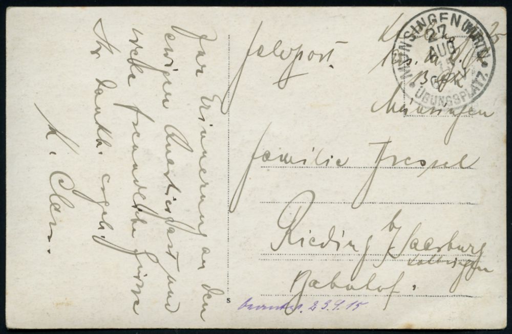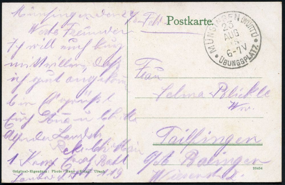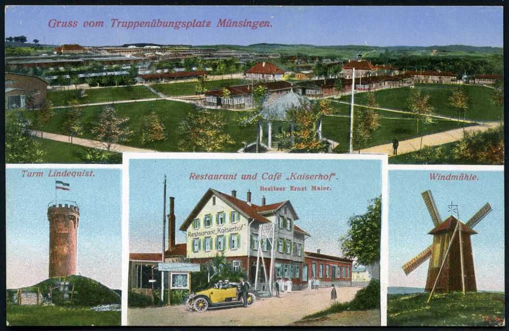 4686 | 12 € | POSTLEITRAUM 7400 (OHNE REUTLINGEN u. TÜBINGEN) : MÜNSINGEN (WÜRTT.)/ *ÜBUNGSPLATZ* 1915 (23.8.) 1K = Hauspostamt Truppenübungsplatz auf Color-Feldost-Ak.: Gruss vom Truppenübungsplatz Münsingen (4 Bilder, dabei Turm Lindequist, Restaurant u. Café "Kaiserhof" etc.) n. Tailfingen (Verlag Foto-Haus "Krieg", Utach) | ![]() ![]() | |