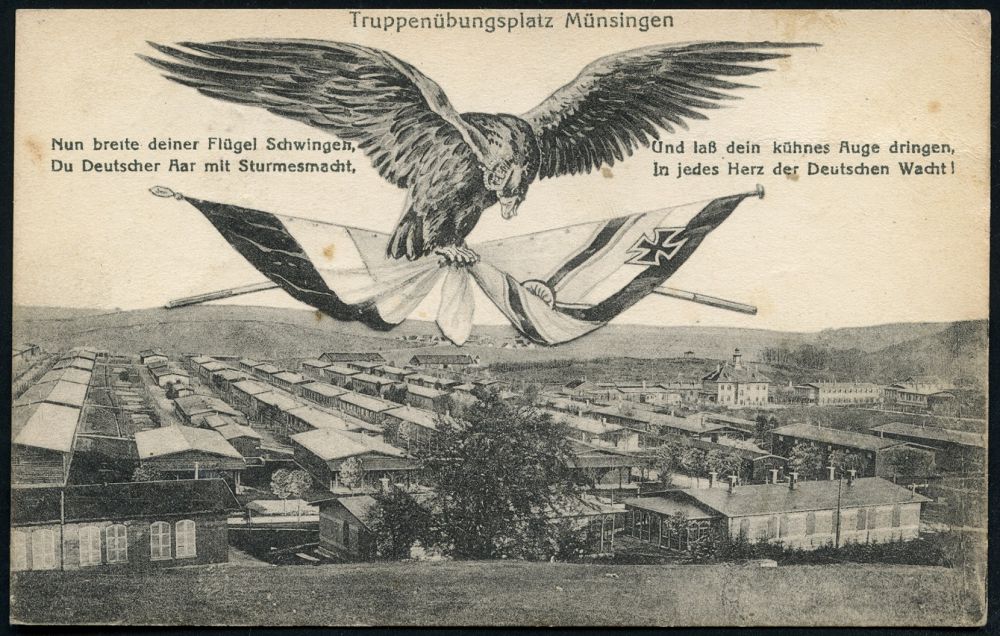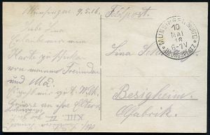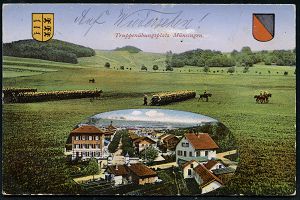 4698 | 13 € | POSTLEITRAUM 7400 (OHNE REUTLINGEN u. TÜBINGEN) : MÜNSINGEN (WÜRTT.)/ *ÜBUNGSPLATZ* 1916 (11.10.) 1K = Hauspostamt Truppenübungsplatz auf s/w.-Propaganda-Feldpost-Ak.: Truppenübungsplatz Münsingen (Adler mit patriot. Vers über Barackenlager) n. Ettlingen (Verlag Gebr. Schmidt, Münsngen) | ![]() ![]() | |