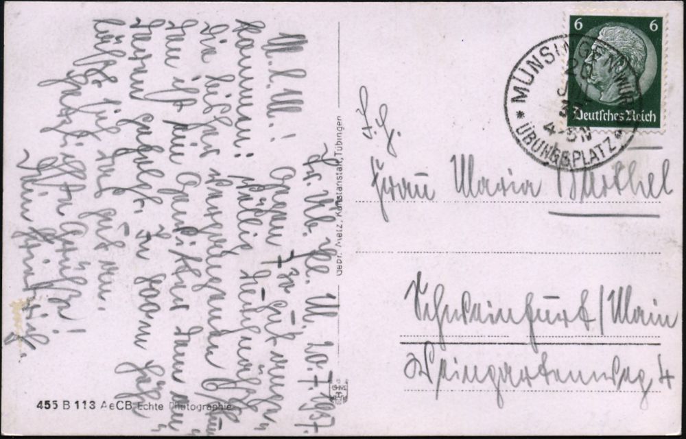 4703 | 14 € | POSTLEITRAUM 7400 (OHNE REUTLINGEN u. TÜBINGEN) : MÜNSINGEN (WÜRTT)/ *ÜBUNGSPLATZ* 1937 (20.7.) alter 1K mit 2 mehrstrahligen Sternen = Hauspostamt Truppenübungsplatz (Mi.44) klar gest., frankierte s/w.-Foto-Ak.: Truppenübungsplatz n. Frankfurt/M. (Mi.516) | ![]() ![]() | |