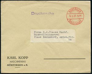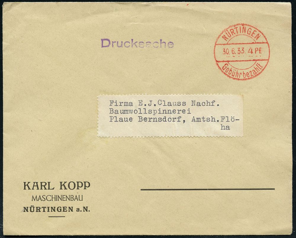 4711 | 12 € | POSTLEITRAUM 7400 (OHNE REUTLINGEN u. TÜBINGEN) : NÜRTINGEN/ 4 Pf./ Gebühr bezahlt 1933 (30.6.) 1K-Brücken-PFS mit Wertziffer , ohne Uhrzeit , klar gest. Firmen-Bf.: KARL KOPP, MASCHINENBAU.. (Dü.A-6, Nr.25) | ![]() | |