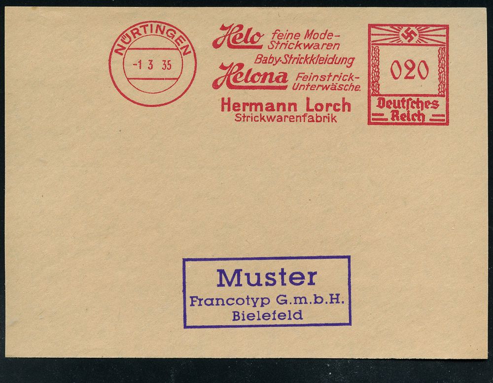 4712 | 35 € | POSTLEITRAUM 7400 (OHNE REUTLINGEN u. TÜBINGEN) : NÜRTINGEN/ Helo/ ..Strickwaren/ Baby-Strickkleidung/ Helona/ Feinstrick-/ Unterwäsche/ Hermann Lorch.. 1935 (1.3.) AFS-Musterabdruck Francotyp "Hakenkreuz" , glasklar gest. Francotyp-Musterblatt vom V o r - Ersttag ! (mit Attest), selten! (Dü.E-3CEo) | ![]() ![]() | |